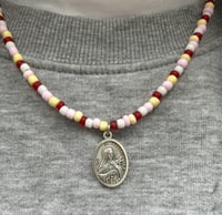 St. Therese is also called the "Little Flower". She was a Carmelite nun, and is a Doctor of the Church. Although her life was only a short 24 years, she lived a life of deep devotion and coined small acts of service done with love and humility the "Little Way". Before she died, she promised that she would send a "shower of roses", so this necklace features white, red, yellow, and pink beads to symbolize rose petals of the most common colors.